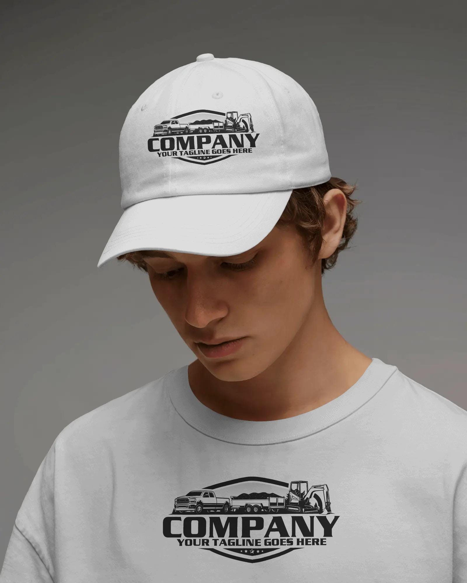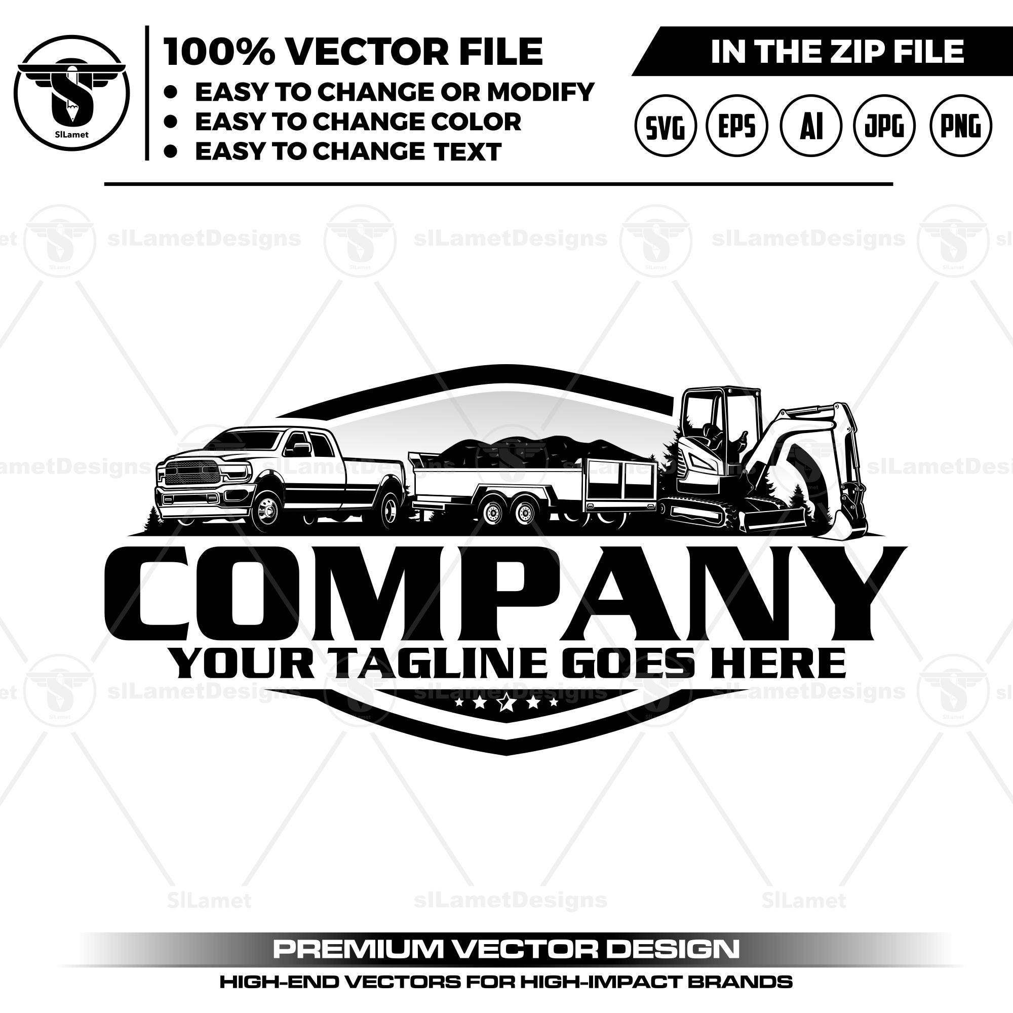 trailer logo, pickup svg, trailer pickup logo, trailer towing, mini excavator logo, pickup dump trailer, contractor logo svg, landscaping logo svg, black white vector, excavation logo art, heavy equipment svg, building logo svg, machinery vector art