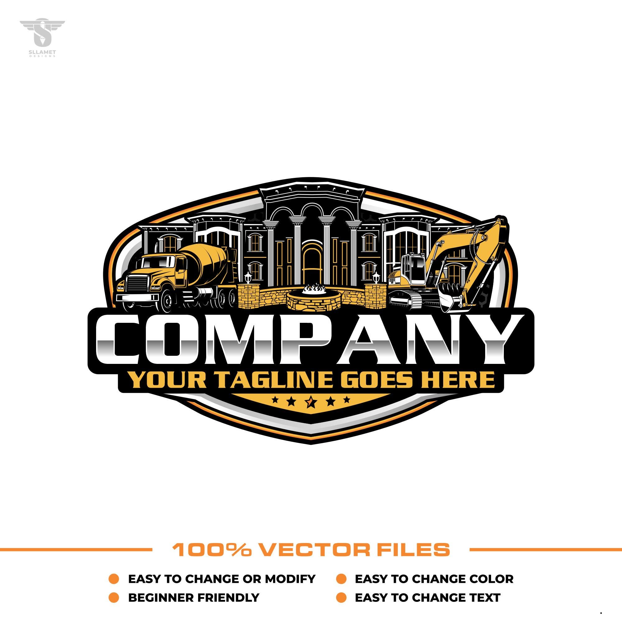 luxury house, hardscaping logo, fire pit, mixer truck, excavator design, backyard living, outdoor masonry, site preparation, contractor identity, landscape build, diy project, professional art